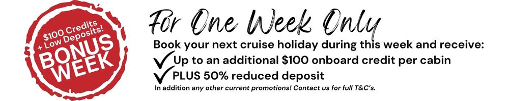 Bonus Offer ends Thursday 30th April 2026. Contact us for more details. *Fares are cruise only, per person (‘PP’) in AUD, in complete twin stateroom as specified, based on lead categories at publication date 10 March 2026 inclusive of discounts. Offer starts 10 March 2026 00:00 AEDT and ends 30 June 2026 23:59 AEST. Valid for new bookings only. Not combinable with other offers. Supplements apply for higher room grades, categories and fare types. Some staterooms have obstructed views. Onboard currency varies – refer to https://www.princess.com/en-au/faq/onboard-experience# for details. Princess Standard fare is the cruise fare only. Princess Plus fare applies to the first 2 guests in the stateroom and includes the cruise fare packaged with the Plus Beverage Package, 1 device Wi-Fi and more. Inclusions are subject to change – see Fare Terms and Conditions. Princess Premier fare is valid for the first two guests in the stateroom and includes the cruise fare packaged with the Premier Beverage Package, 4 device Wi-Fi and more. Inclusions are subject to change – see Fare Terms and Conditions. First and second guests in a stateroom must be booked on the same fare type. Princess Plus and Princess Premier must be booked for the entire duration of the voyage. #Onboard Spending Money (‘OBS’) Offer (‘OBS Offer’) is per room, in AUD and applied to the first 2 guests in the room only. Amount varies by itinerary duration as specified. When booking on a Princess Standard fare: for cruises 6 nights and under – receive up to $40 OBS per room; for cruises 7-17 nights – receive up to $120 OBS per room; for cruises 18-31 nights – receive up to $250 OBS per room; for cruises 32 nights and over – receive up to $400 per room. When booking on a Princess Plus or Princess Premier fare: for cruises 6 nights and under – receive up to $100 OBS per room; for cruises 7-17 nights – receive up to $300 OBS per room; for cruises 18-31 nights – receive up to $600 OBS per room; for cruises 32 nights and over – receive up to $1000 per room. Amount varies by itinerary duration as specified. OBS expires at the conclusion of your cruise, is not transferable, not refundable, not redeemable for cash and cannot be used in the casino or medical centre). All travel is subject to Princess Cruises Passage Contract at https://www.princess.com/enau/legal/passage-contract which guests are bound by. Cruise itineraries and onboard offerings are not guaranteed. Charges may apply for some activities, venues and menu items. Credit card surcharges (Visa/Mastercard 1.1%; AMEX/Diner’s Club 2.75%). Carnival plc trading as Princess Cruises ABN 23 107 998 443.